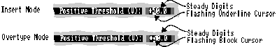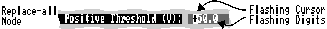 Numbers and Text Strings are initially presented with all characters flashing to indicate that the editing mode is replace-all, i.e. any character typed at the cursor deletes all existing characters.
