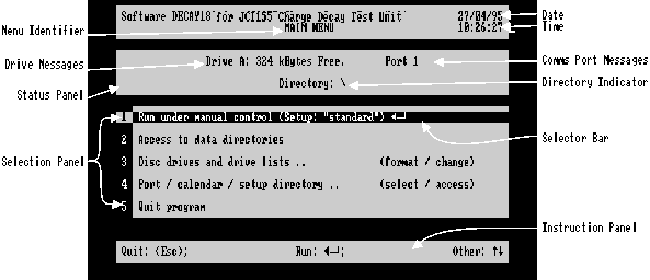 . The latter is associated with retreating back to a higher level menu; in the main menu it terminates the program. When these keys are pressed on an inappropriate action, the selector bar will automatically move to an appropriate action, and will respond to the next press of the same key.