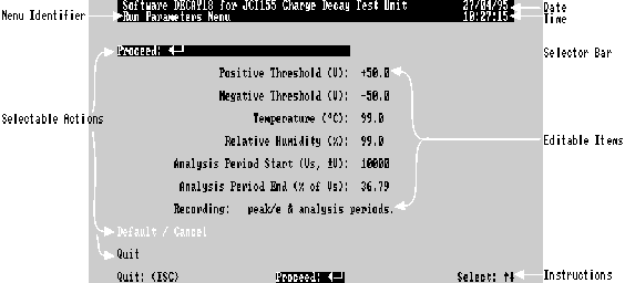The Run Parameters Menu is shown at figure 10.1 below (also figure 2.2 above). It has a Proceed action, seven editable items, Default / Cancel and Quit actions.