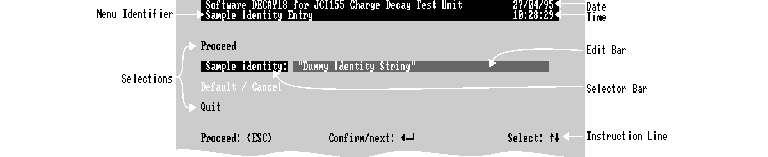 This menu is shown in figure 10.3 below (also at figure 2.3) and is encountered in manual control mode when proceeding from the Run Parameters menu (figure 10.1 above) or having selected the Repeat Run option in the Analysis / Graph Preparation Menus. It offers a Proceed action, entry / edit of the sample identity, a Default / Cancel line, and a Quit action.