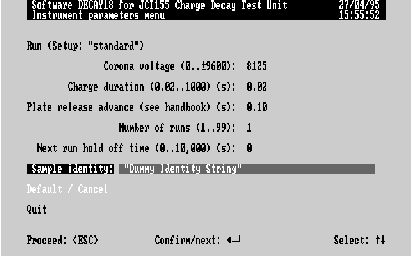 This menu is shown in figure 10.4 below (also at figure 3.2) and is encountered in computer control mode when proceeding from the Run Parameters menu (figure 10.1 above) or having selected the Repeat Run option in the Analysis / Graph Preparation Menus. It offers a Proceed action, five editable instrument parameters, entry / edit of the sample identity, a Default / Cancel line, and a Quit action.
