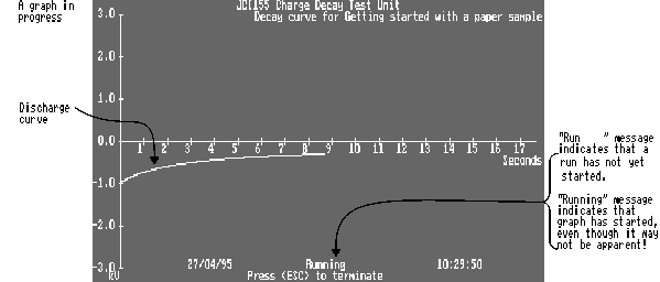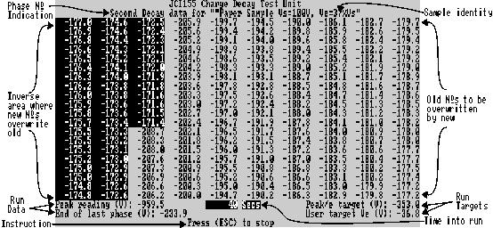 If data collection lasts for more than 15 seconds, the initial graph screen is replaced by a screen in which the surface potential data is written in numeric form to the screen, 1200 times per decay phase, using a page of 200 numbers overwritten 6 times per phase.